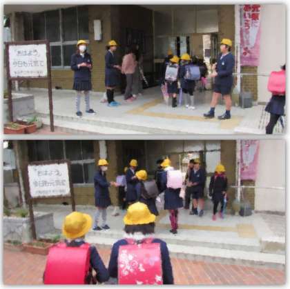 本日より、あいさつ強調週間としています。代表委員の児童が毎朝、玄関に立ち、登校してくる児童にあいさつをします。元気よくあいさつができると、代表委員からカードが渡されます。そのカードを学級ごとに、台紙に貼っていきます。