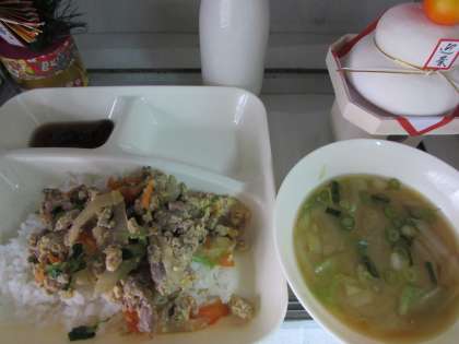 本日の給食の献立をご紹介します。本日の献立は、他人丼、みそ汁、黒豆の煮物、牛乳でした。