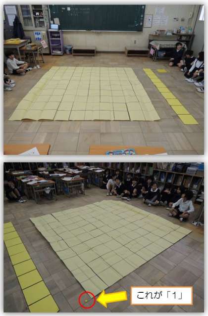 2年生の算数の学習です。「1」のタイルに対し、「10000」という数がどれぐらいの大きさになるのか、調べました。広げてみると、「10000」という数の大きさが実感できました。