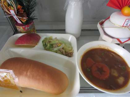 本日の献立は、コッペパン、マーマレード、ビーフシチュー、ツナとキャベツのソテー、りんご、牛乳でした。