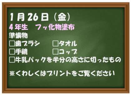 明日(1月26日)、4年生は虫歯予防を目的として、フッ化物塗布を行います。昨日持ち帰りましたプリントをご覧いただき、ご準備よろしくお願いします。
