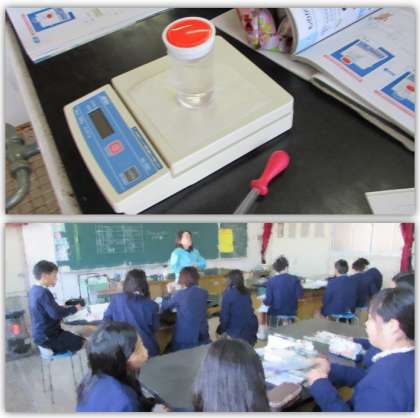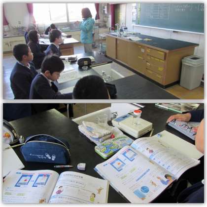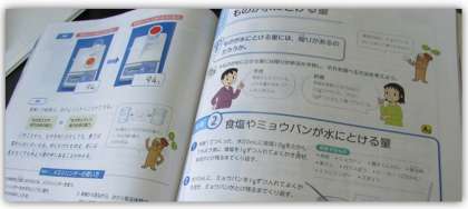 5年生の理科の学習です。食塩を水に溶かす実験から、物が水に溶けても全体の重さは変わらないことに気づきました。