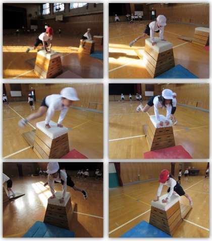 2年生の体育の学習です。体育館では、跳び箱の開脚跳びに取り組んでいます。
