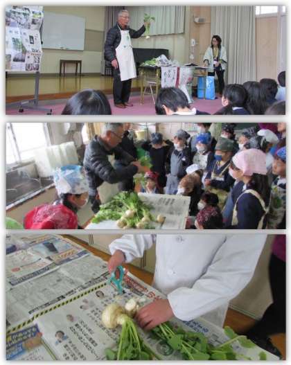 初めに、『なにわの伝統野菜』について、教えていただきました。天王寺かぶらが、野沢菜と同じものだと知り、子どもたちも興味がわいたようです。