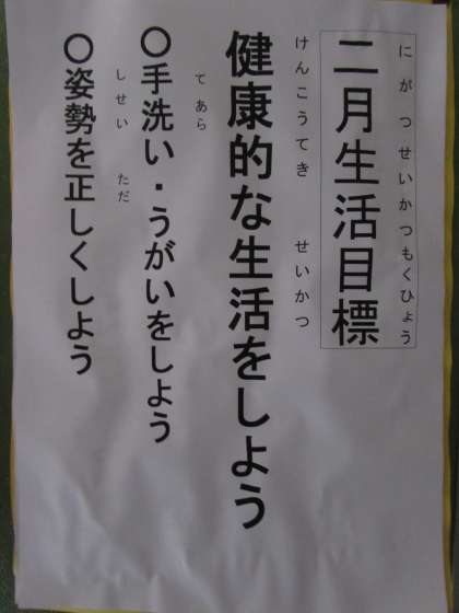 2月の生活目標です。2月の目標は、『健康的な生活をしよう』です。具体目標は、