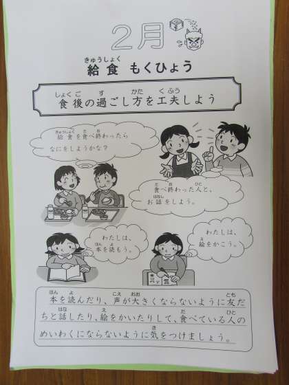 2月の給食目標です。2月の目標は、『食後の過ごし方を工夫しよう』です。