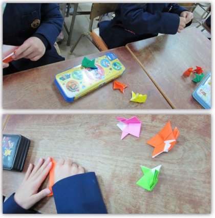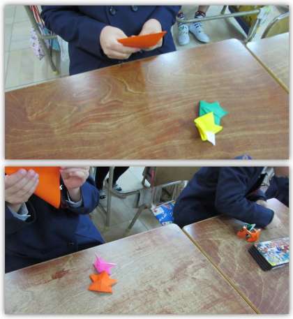 1年生の生活科の学習です。楽しく遊べるおもちゃを作っています。画像は、色紙を使って、とんとんずもうの力士を作っている場面です。