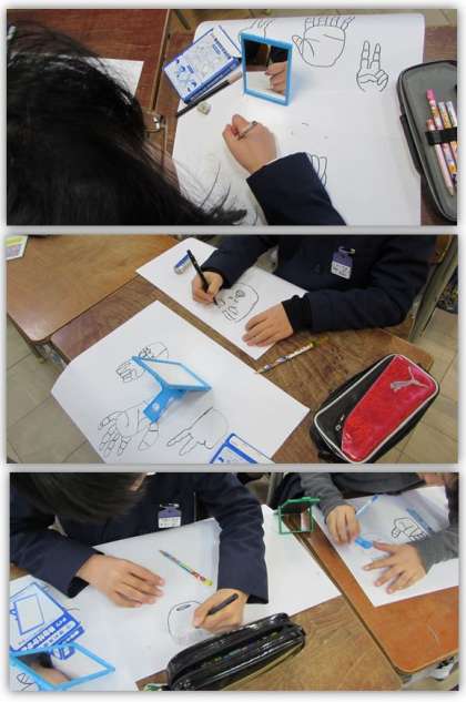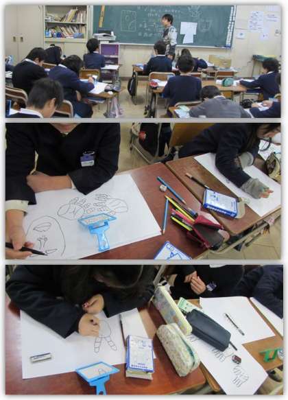 4年生の図画工作の学習です。4年生では、初めて木版画に取り組みます。今日は、自分の姿を題材として、下絵を描きました。