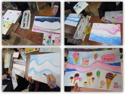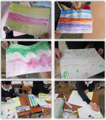 3年生の図画工作の学習です。1人1枚ずつ、『道』を描いています。花の咲く道、お菓子がたくさんある道、海の中の道…子どもたちは、様々な道を考え、描いていきました。出来上がったら、全部の絵をつなぎます。