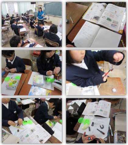 3年生の理科の学習です。磁石どうしを近づけて、引き付け合うときと退け合うときを調べました。