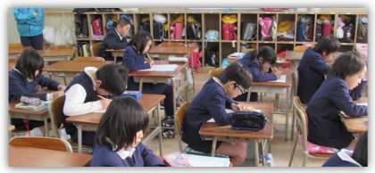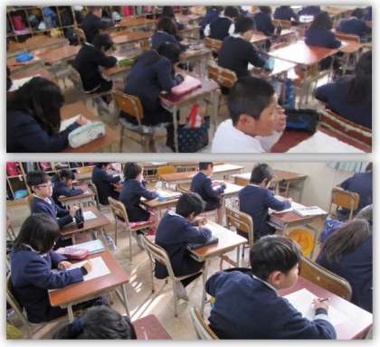 3年生の算数の学習です。かけ算の筆算のテストに取り組んでいます。「1本●円の鉛筆が1ダースで何円か」という問題が難しかったようです。
