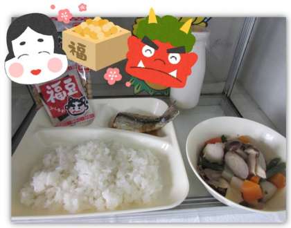 病気や悪い出来事を追い払うために、節分の日には「鬼は外、福は内」と言って、豆まきをしたり、年の数だけ煎り大豆を食べたりする習慣があります。鬼が苦手なヒイラギの枝に、いわしの頭を刺して、家の入口に建てる習慣もあります。本日の給食では、節分の行事献立として、「いわしのしょうがじょうゆがけ」と「煎り大豆」が出ました。