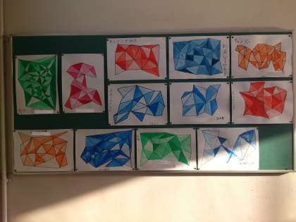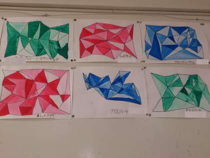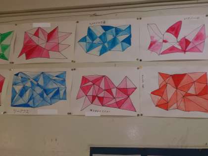 5年生の図工の作品を紹介します。画用紙に、点を20個、打ちます。そして、それらの点をつないでいって、図形を作り、その線で囲まれた中を絵の具で塗っていきました。絵の具は、各自、1色。水の量を加減することで、1色の絵の具でも、さまざまな色になりました。できるだけ、全部の部屋を違うように塗ることを目標に塗りました。塗り終わったら、画用紙をくるくると回してみて、何に見えるか考え、それを作品の題としました。