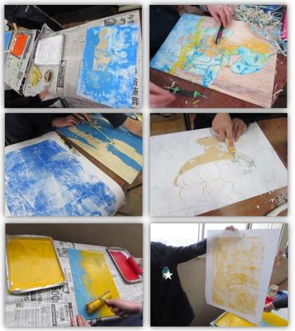 6年生の図画工作の学習です。木版画の一版多色刷りで、世界の名画の表現に挑戦します。