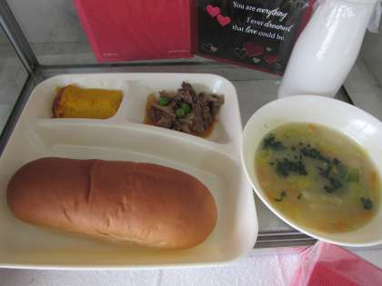 本日の給食の献立をご紹介します。本日の献立は、黒糖パン、牛肉のデミグラスソース煮、コーンスープ、かぼちゃのプリン、牛乳でした。