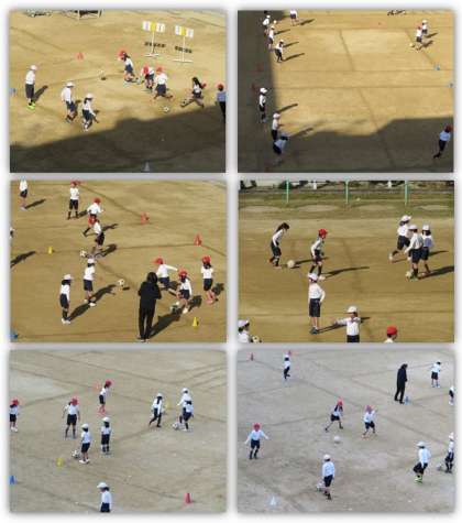2年生の体育の学習です。運動場で、ボールを蹴る運動に取り組んでいます。