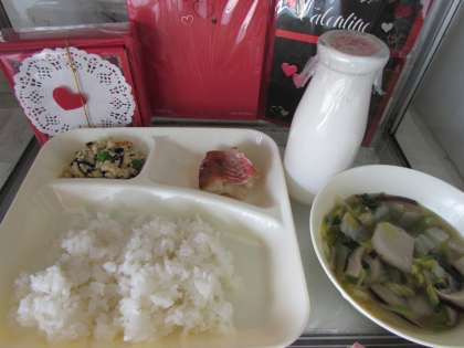 本日の給食の献立をご紹介します。本日の献立は、ご飯、あかうおのレモンじょうゆかけ、薄くず汁、高野豆腐の炒り煮、牛乳でした。