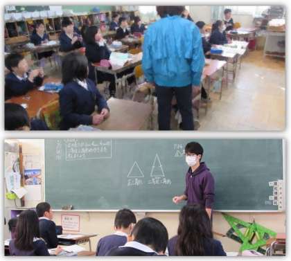 3年生の算数の学習です。底辺が3cmで2つの辺が4cmの二等辺三角形のかき方を考えました。そして、定規とコンパスを使うことでかけることを理解し、作図練習をしました。