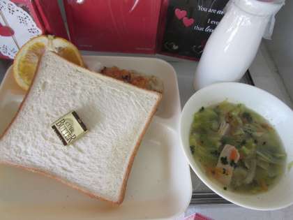 本日の給食の献立をご紹介します。本日の献立は、食パン、牛乳、バター、押し麦のグラタン、スープ、いよかんでした。