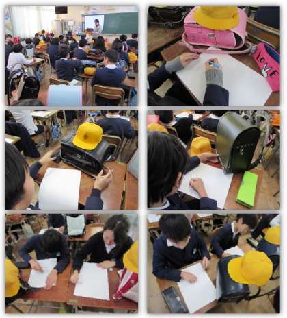 6年生の図画工作の学習です。6年間、共に過ごしたランドセル、黄帽を描きます。どの角度から、どのように描こうか、思案中です。
