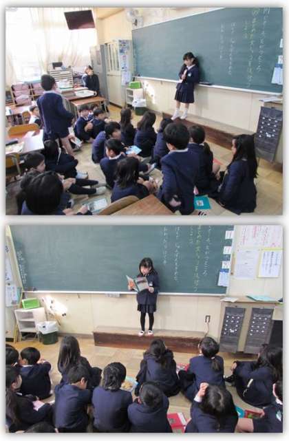 2年生の国語の学習です。2つの物を比較して、同じところと違うところを文章に書きました。そして、皆に発表し、聞いた子どもたちは、感想を言っていきました。