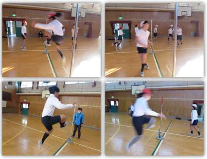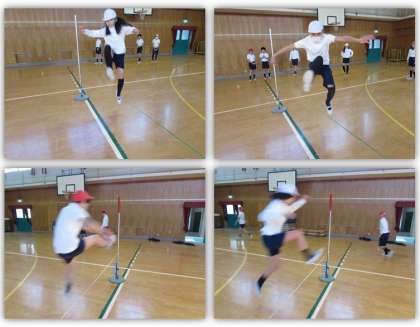 6年生の体育の学習です。高跳びの練習です。今日は、ゴムを張った上を、はさみ跳びで跳ぶ練習をしました。