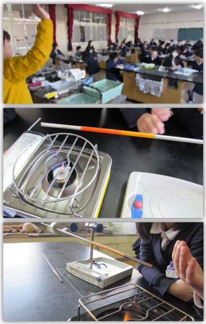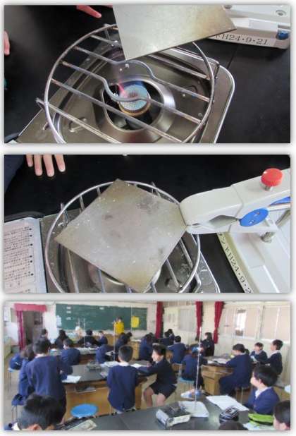 4年生の理科の学習です。金属の棒や金属の板を加熱し、熱の伝わり方を調べました。