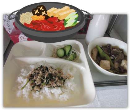 本日の給食の献立をご紹介します。本日の献立は、ご飯、すき焼き煮、もやしときゅうりのしょうが漬け、ツナっ葉炒め、牛乳でした。