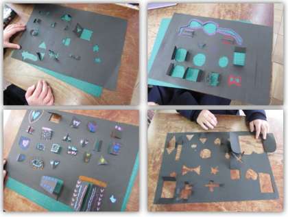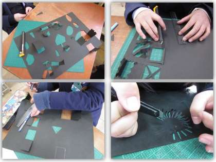 2年生の図画工作の学習です。カッターナイフを使って、画用紙に切り込みを入れ、いろいろな形の窓を開けていきます。