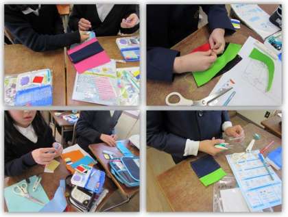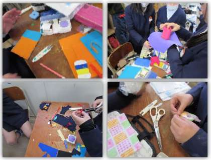 5年生の家庭科の学習です。裁縫道具を使い、小物作りに取り組んでいます。