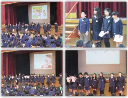 本日の集会は、保健委員会による『学校保健委員会』を行いました。スクリーンを使って、睡眠が健康にとって大切であることを伝えました。