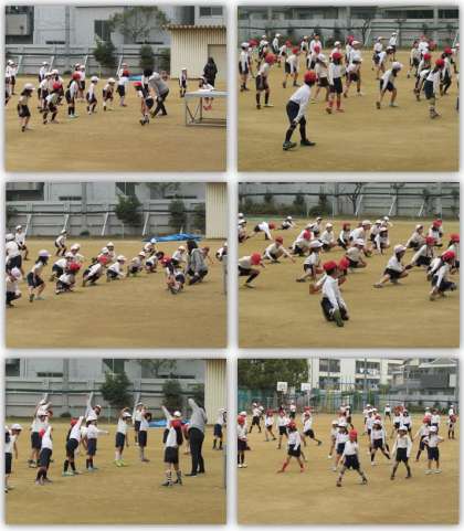 2年生の体育の学習です。画像は、準備運動をしている場面です。実技の前に、しっかりと体を動かします。