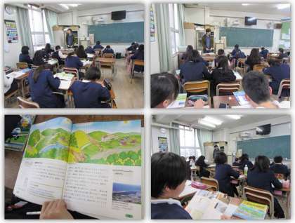 5年生の社会科の学習です。森林がある場合とない場合の様子を比較して、森林にはさまざまなはたらきがあり、人々の生活と深く結びついていることに気づきました。