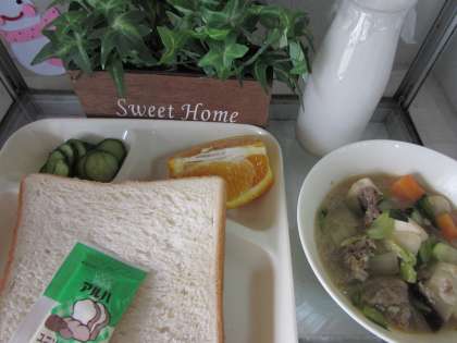 本日の給食の献立をご紹介します。本日の献立は、食パン、マーガリン、豚肉と豆腐の旨煮、きゅうりの中華和え、デコポン、牛乳でした。