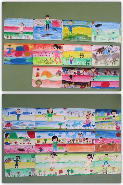 3年生の図画工作の作品です。皆の作品をつないでいくと、長い長い道が出来上がりました。途中、いろいろな景色が楽しそうです。