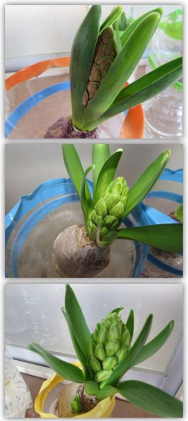 2年生が水栽培で育てているヒヤシンスの様子です。つぼみが、少しずつ大きくなってきました。何色の花が咲くのか、とても楽しみです。