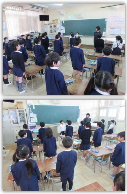 1年生が授業の初めのあいさつをしています。背筋を伸ばし、元気な声で『始めます!』