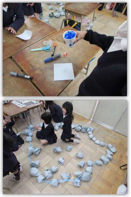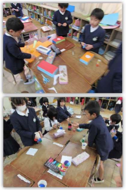 1年生は、2月26日(月)、幼稚園・保育所の子どもたちを招いて、『あそび交流会』を行います。昨年、千本小学校に来て、あそび楽しく遊んだ子どもたちも多いことと思います。1年たって、今度は自分たちがお招きする側です。今日は、おもちゃ作りに取り組んでいました。