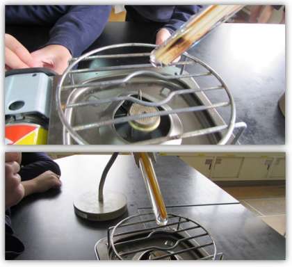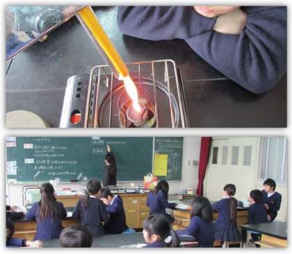 4年生の理科の学習です。水のあたたまり方について、金属について調べた結果などをもとに予想しました。実験の結果から、水は、下の方を熱すると、熱せられた水が上の方へ動いて上から順にあたたまることに気付きました。