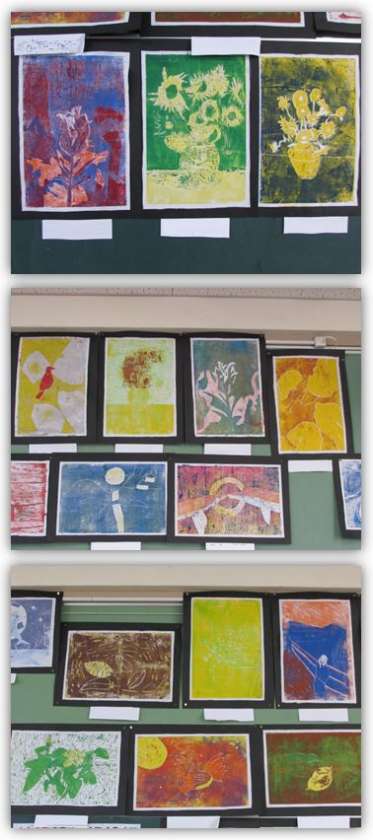 6年生の図画工作の作品です。木版画の一版多色刷りで、世界の名画の表現に挑みました。