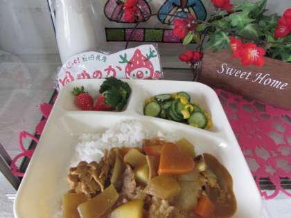 本日の給食の献立をご紹介します。本日の献立は、ポークカレーライス、きゅうりとコーンのサラダ、いちご、牛乳でした。