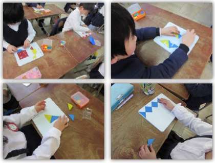 かたちづくり(1年生) 公開日 2018/02/20 更新日 2018/02/20 1年生 2月20日(火) 1年生の算数の学習です。直角二等辺三角形の色板を使って、いろいろな形を作りました。 いいね(0)