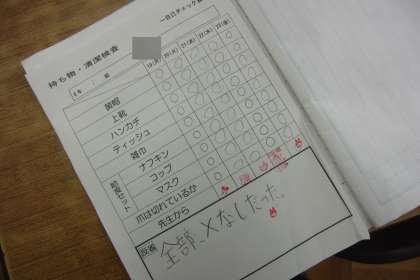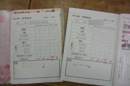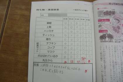 6年生は、毎日、主に健康にかかわる持ち物について、自己チェックを行っています。初めのころは、忘れ物もありましたが、2日目、3日目と、どんどん忘れ物がなくなっていきました。ハンカチやティッシュなど、意識して用意できるようになってきていると思います。これからも、続けていってほしいと思います。