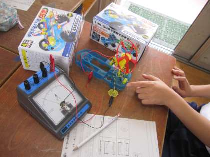 4年生の学習の様子をご紹介します。理科で、乾電池とモーターの動きについての学習をしました。乾電池の向きを変えると、モーターが逆回転をしました。それを見た子どもたちは、「おおっ。」と、声をあげました。「やっぱり。」と、いう声も聞こえました。