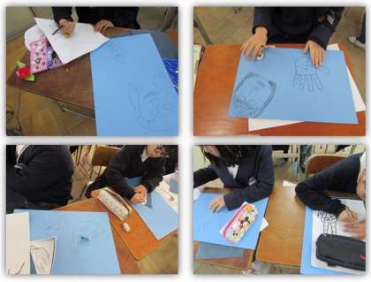 4年生の図画工作の学習です。木版画に取り組みます。画像は、下絵を版木に写し取っている場面です。