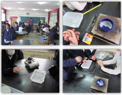 5年生の理科の学習です。水溶液を冷やしたり、熱して水を蒸発させることで、溶けていた物を取り出すことができるかを調べました。
