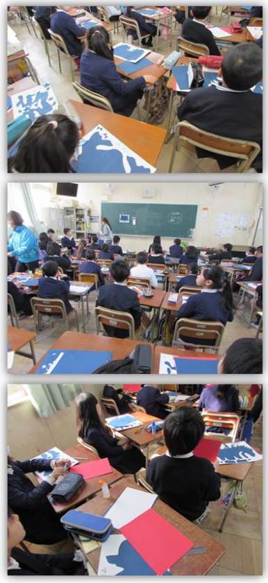 3年生の図画工作の学習です。色画用紙を使い、シンメトリー(左右対称)な形を作っていきました。