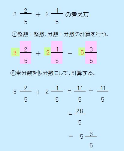 4年生の算数の学習です。分母が同じ帯分数の、たし算の計算の仕方を考えました。