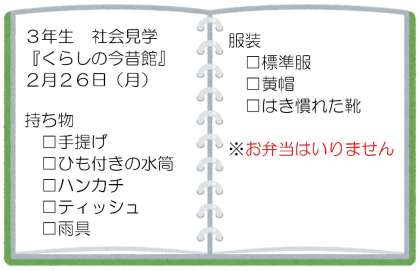 2月26日(月)、3年生は社会見学で、くらしの今昔館に行きます。帰校後、給食を食べますので、お弁当はいりません。しおりをご覧いただき、ご準備よろしくお願いいたします。