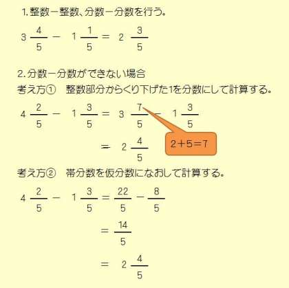 4年生の算数の学習です。分母が同じ帯分数のひき算を学習しました。そして、帯分数の分数部分がひけないときは、整数部分から繰り下げた1を分数になおして計算する方法と、帯分数を仮分数になおして計算する方法があることをまとめました。